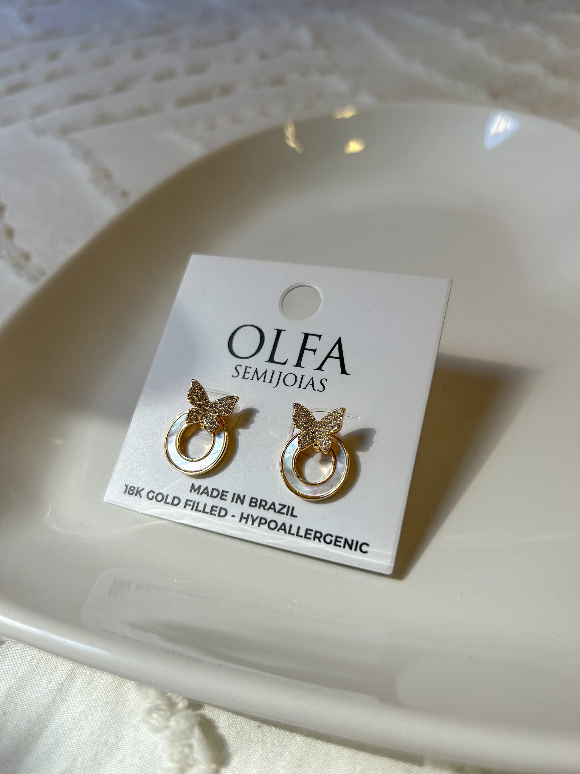 Brinco banhado a ouro 18k com camada protetora de verniz, madrepérola e detalhes cravejados em zircônia.